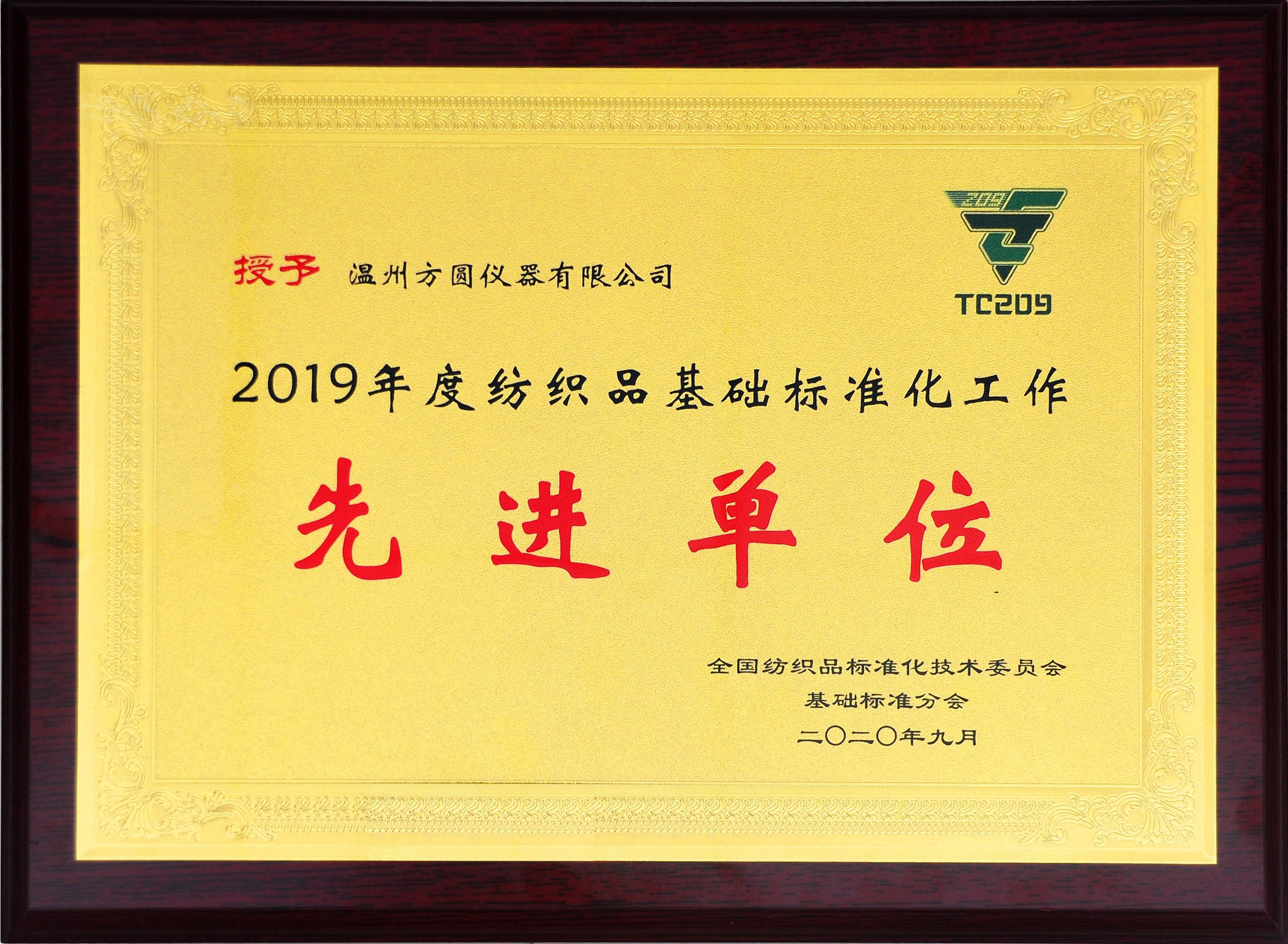 2019年度紡織品基礎化標準工作先進單位獲得者“溫州方圓儀器有限公司”